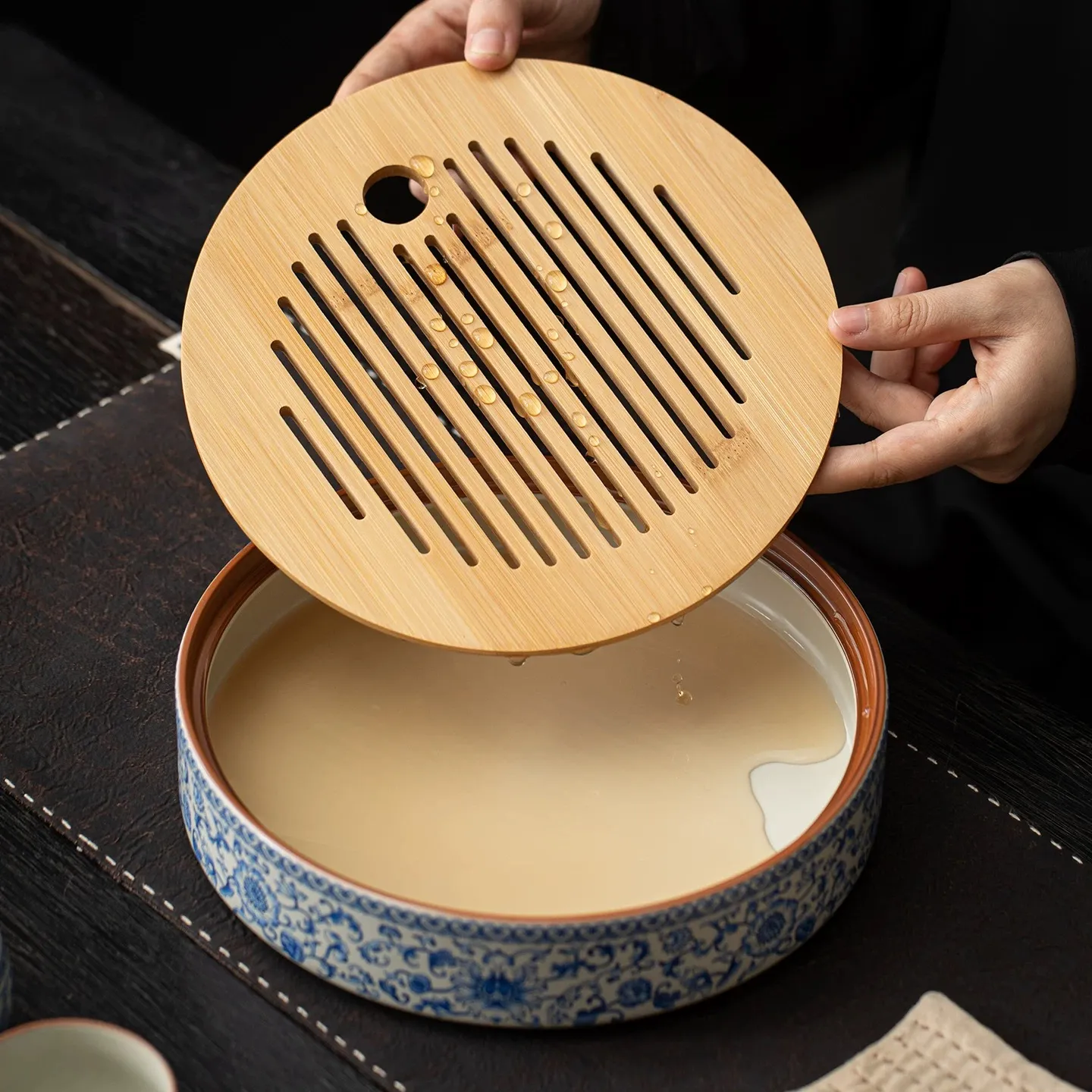 The center is paired with a bamboo water storage grid, and the tray adopts an integrated water storage design. It has a diameter of 25 centimeters and a capacity of 1200 milliliters 40.58 fluid ounces. The tray surface is decorated with interlocking lotus patterns. It boasts excellent water storage performance, naturally collecting waste water during tea preparation to keep your tabletop clean and tidy.