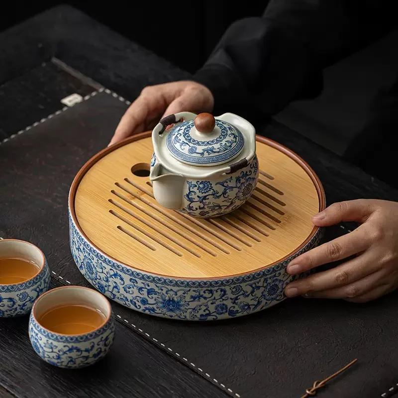 Gongfu Tea Tray, Round Ru Kiln Blue and White Porcelain Tea Tray