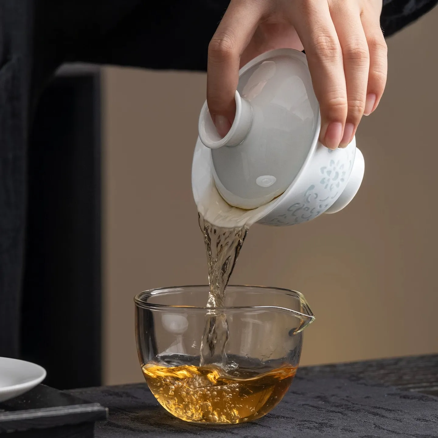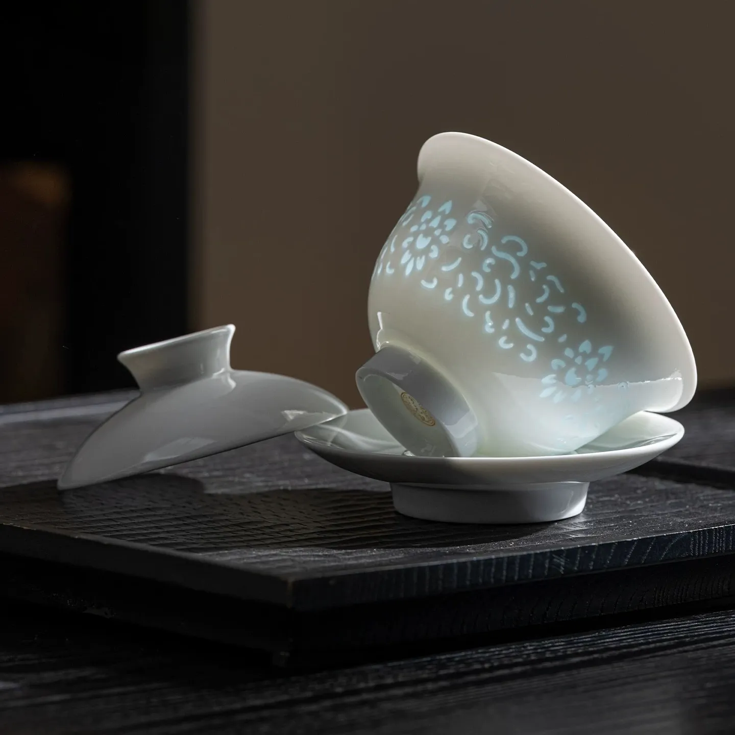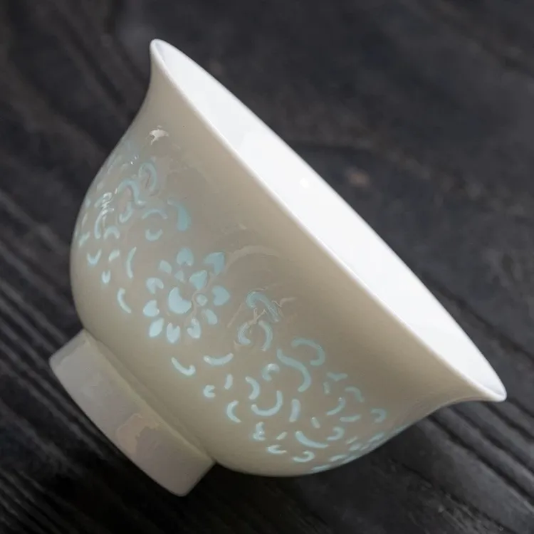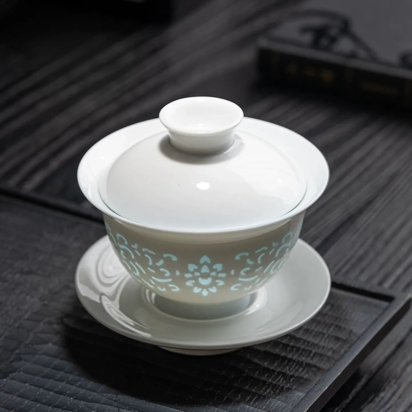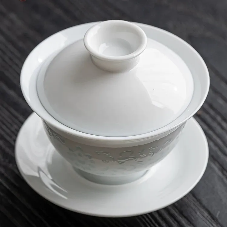 This 180ml jade porcelain three-piece gaiwan features a fine and delicate jade porcelain body, decorated with intricate hand-carved floral patterns. It boasts excellent light transmittance. When filled with tea, the patterns glow elegantly through the light, looking lively and refined.