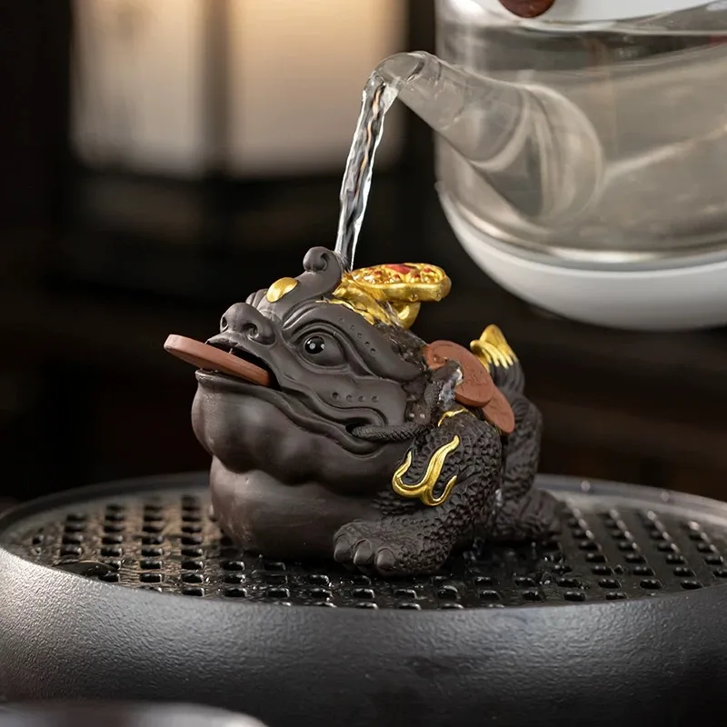 The Golden Toad is one of the most popular tea pets in Chinese tea culture. It symbolizes attracting wealth and good fortune, which is deeply loved by tea enthusiasts. Yixing clay is a precious material for making Chinese tea ware. The Golden Toad tea pet crafted from it boasts a smooth and gentle texture. With regular pouring of tea liquor over its surface, a smooth and lustrous patina will gradually develop, and a rich mellow tea aroma will emanate from it.