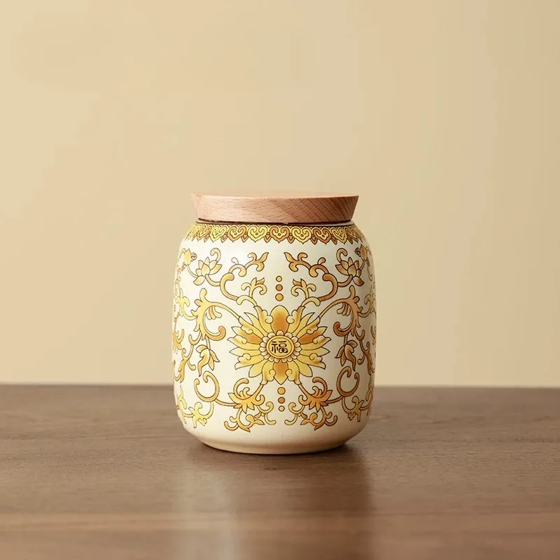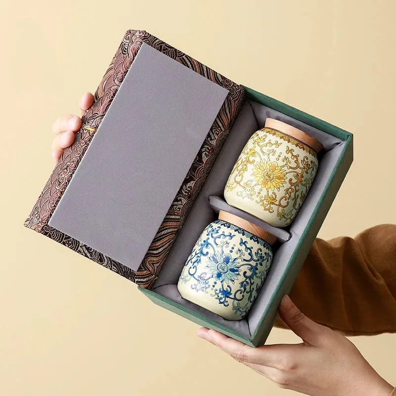 This portable travel tea caddy is made of Ru porcelain fired at high temperature, featuring a smooth and delicate glaze. Adorned with interlocking branch patterns, it boasts elegant blue and white hues and luxurious yellow glaze, exuding strong retro charm. With a compact 200ml capacity and an airtight wooden lid, it effectively prevents moisture and locks in tea aroma, making it perfect for carrying loose tea black tea and other varieties while traveling to meet your tea tasting needs. Available in single caddy and gift set options, it is suitable for both personal use during trips and as a souvenir.